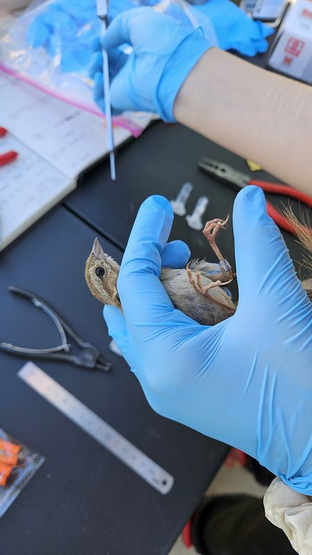 In the summer of the 2025, I began performing my mist netting, banding, and sampling of various passerine species around Tucson, AZ! Our sampling sites range range from rural desert scrub to urban environments, including a special manmade wetland/wildlife oasis that stems from a local water treatment plant. We are taking blood and retrice feather samples to test for active West Nile Virus (WNV) infection via PCR, as well as evidence of past infections via ELISA antibody testing.  Bird trapping occurs simultaneously with mosquito trapping to inform us of the specific place and time of bird-mosquito transmission.